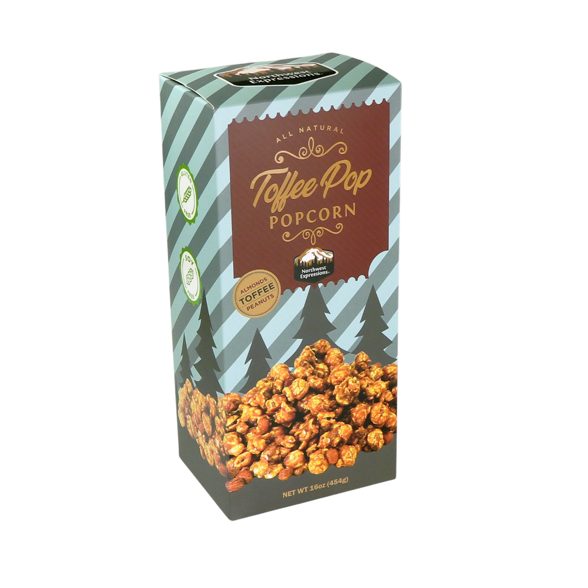 Toffee Pop toffee covered popcorn is one of Northwest Expressions most requested gourmet confections, and is handmade by mixing our own signature Butter Crunch Almond Toffee, petite peanuts and fluffy mushroom popped corn.